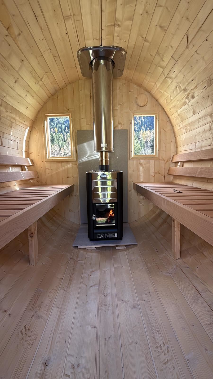 Ab diesem Winter steht Ihnen unsere neue Fasssauna im Außenbereich zur freien Verfügung. Nach einem aktiven Tag in den Bergen entspannen Sie hier in wohliger Wärme – umgeben von frischer Bergluft und beeindruckendem Panorama.